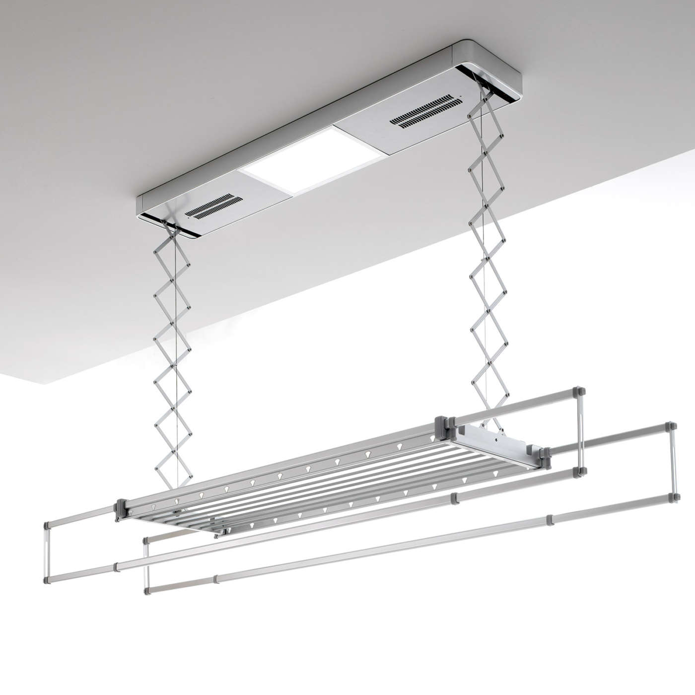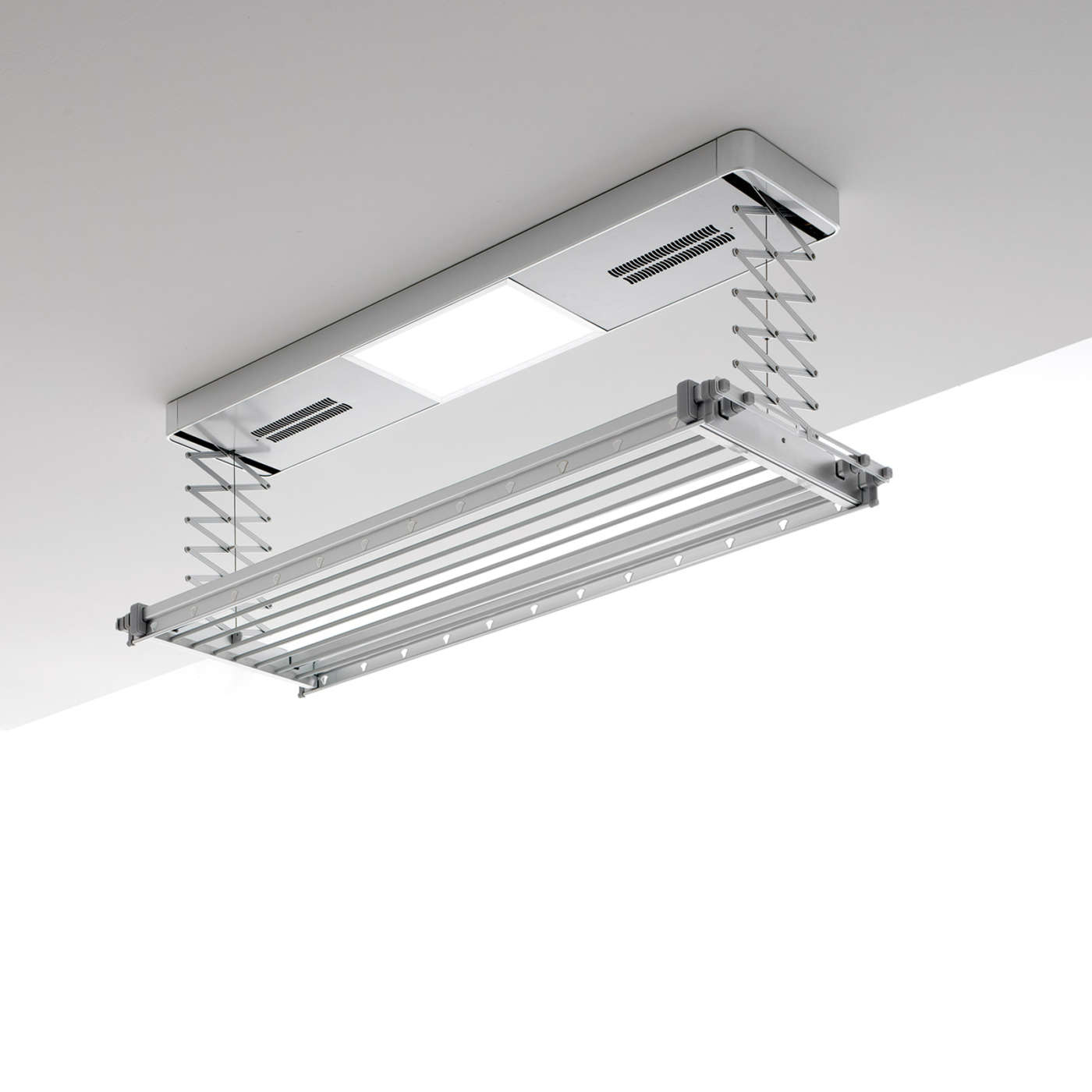 La griglia che scende dal soffitto di ben 1,80 m si può calare tramite telecomando all’altezza più comoda per stendere nel massimo confort. Basta poi un altro clic, risale verso il soffitto e si accendono le ventole nella modalità desiderata.