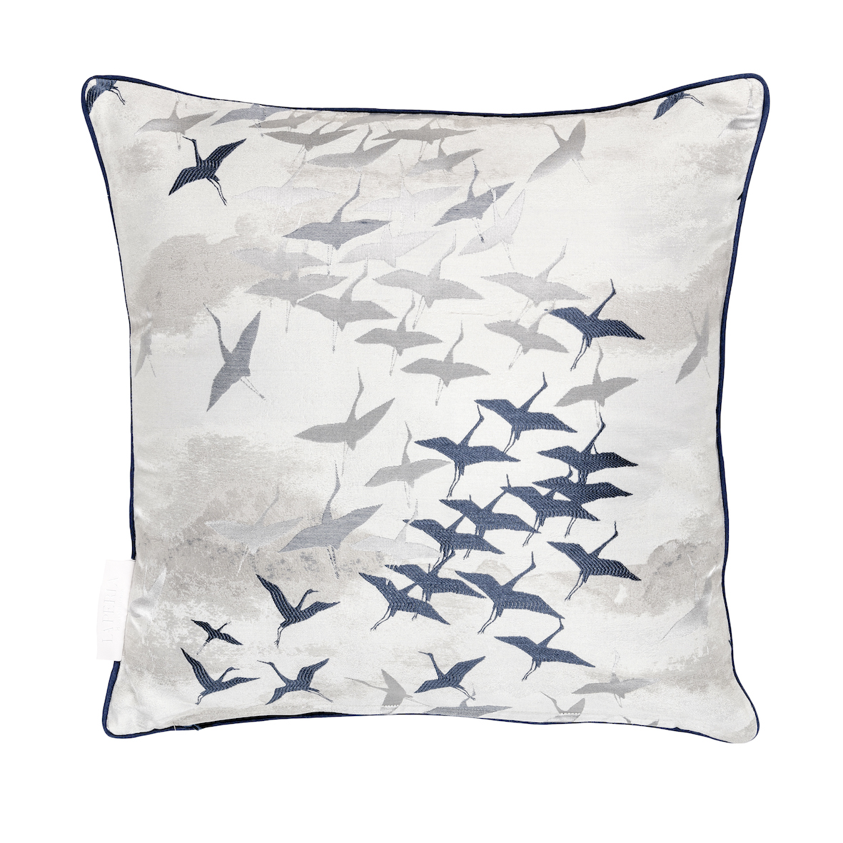 FazziniAirone di La Perla Home by Fazzini è composta da: completo copripiumino, quilt e il cuscinetto decorativo, realizzati in esclusivo tessuto jacquard di seta e viscosa. Il suo decoro rappresenta il viaggio migratorio degli aironi che, con la loro eleganza, si alzano in volo e disegnano il cielo compiendo un rituale che si ripete sempre uguale da millenni.