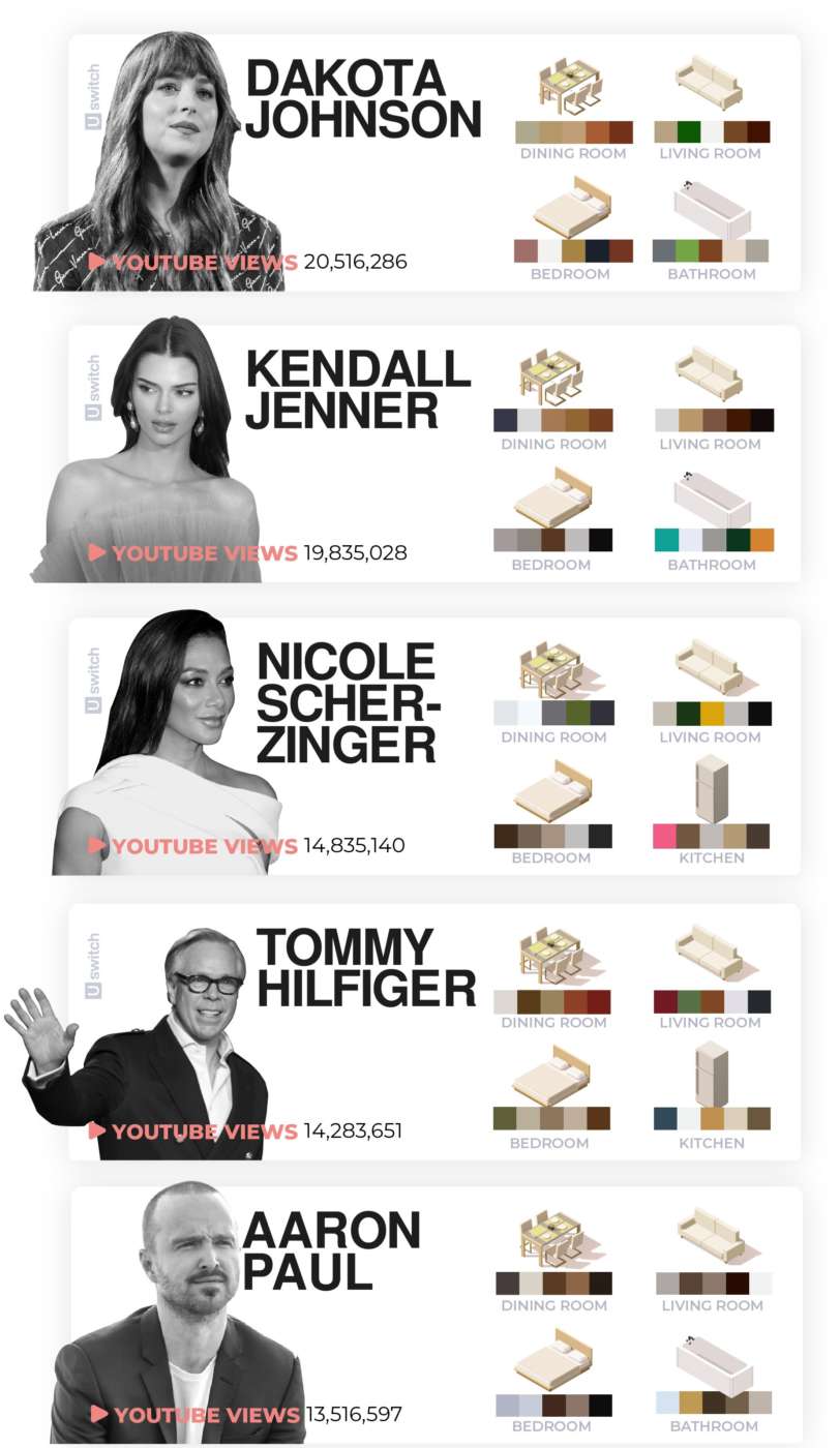 Per la tavolozza colori completa e per la ripartizione completa dei dati, visitare il post del blog qui: https://www.uswitch.com/mortgages/guides/celebrity-colour-palettes/.