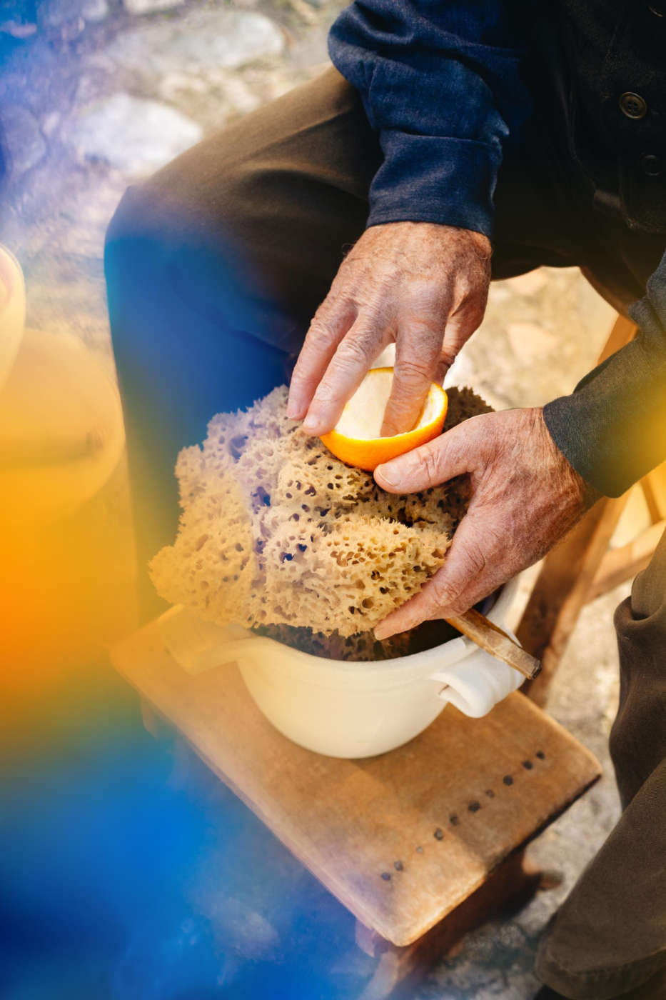 La Maison, che si è sempre impegnata per salvaguardare le lavorazioni artigianali più antiche e preziose tipiche dei micro-territori, ha coltivato a lungo questo progetto. La spugnatura è una tecnica che solo pochissimi artigiani ancora praticano. È un metodo esclusivamente manuale per estrarre l’essenza dagli agrumi, che richiede una maestria tradizionale e affascinante. Si tratta di una vera e propria arte, che richiede tempo e una sapienza di gesti precisi e delicati. Per iniziare, l’artigiano taglia in due metà uguali il frutto, con un coltello ben affilato. Successivamente, usando un utensile simile a un cucchiaio chiamato “cavatore”, separa la polpa dalla buccia. Subito dopo, le scorze di arancia vengono strofinate, a mano, su spugne marine, che ne assorbono tutta l’essenza. Nella fase finale, l’artigiano strizza le spugne, ricche di olio essenziale, con movimenti precisi, e raccoglie l’elisir agrumato in contenitori di terracotta.