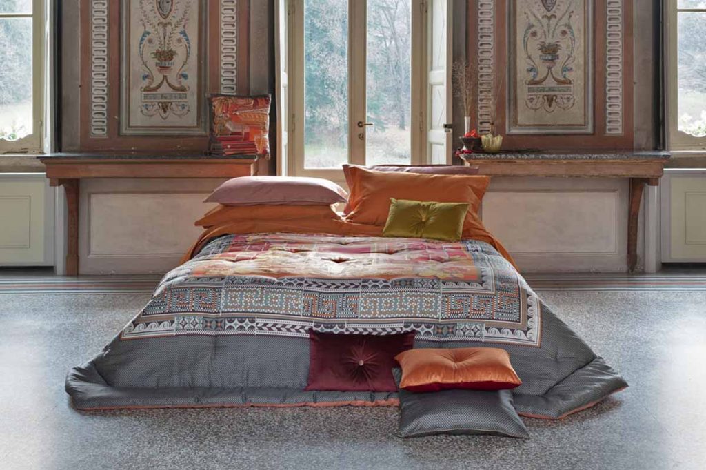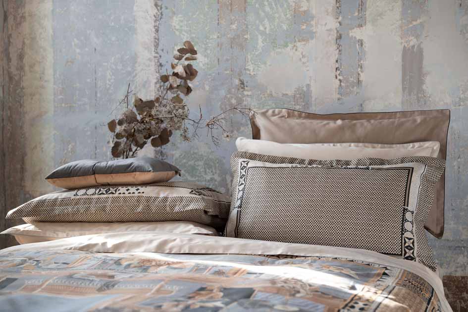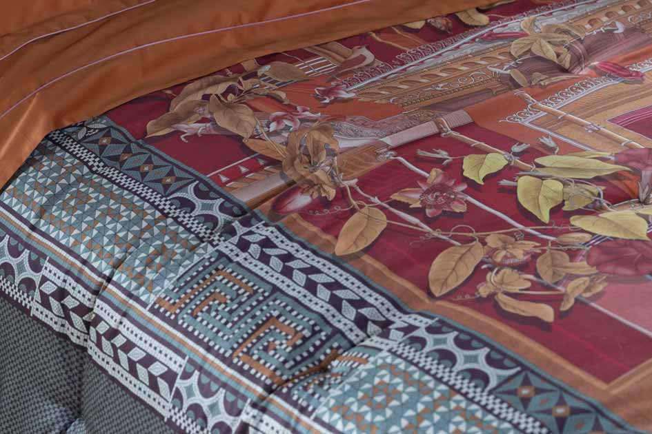 Trapunta, parure e completo letto Evoè sono caratterizzati da un motivo centrale, un decoro posizionato centralmente per rendere unico il racconto e la sua composizione.