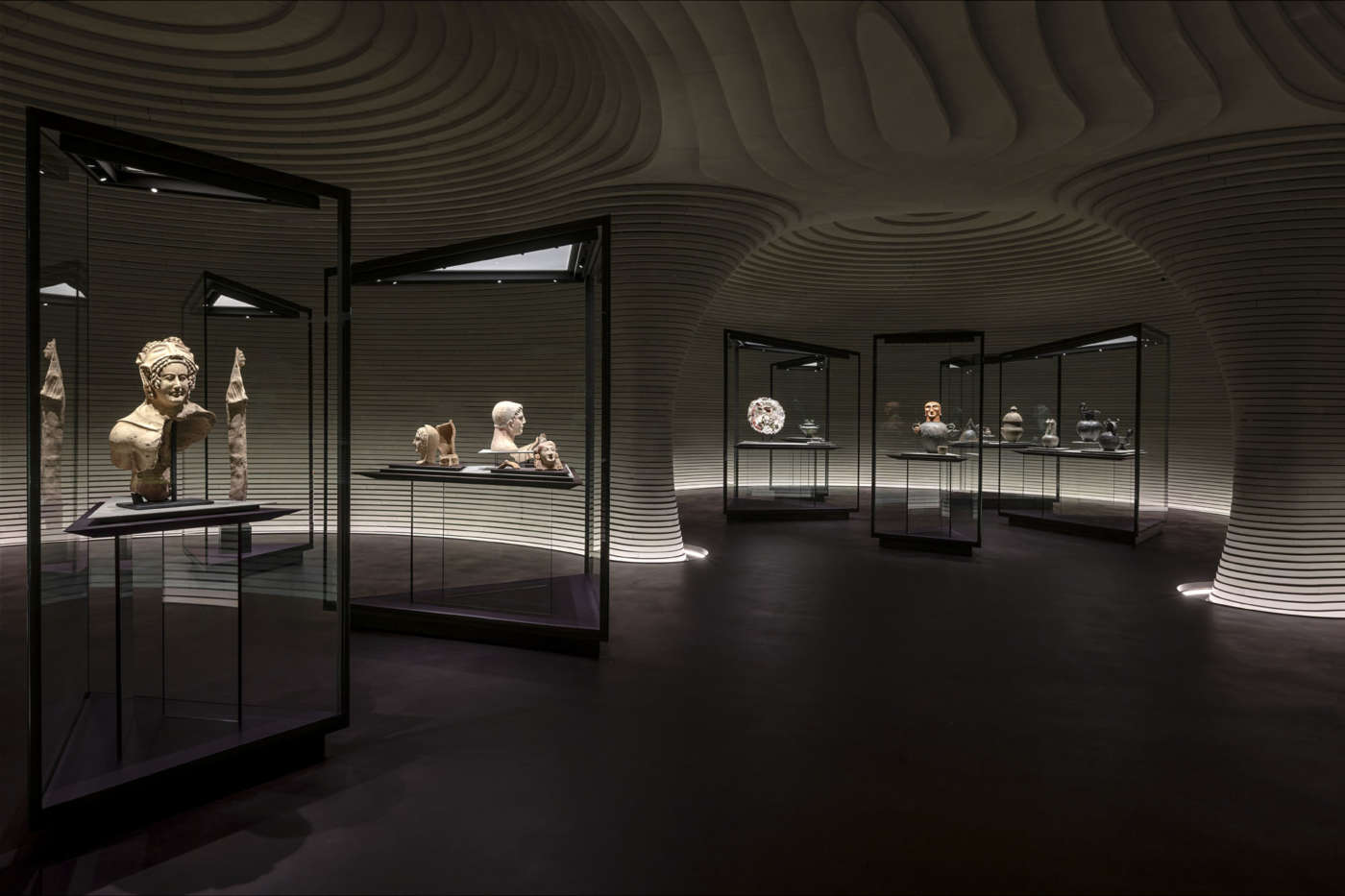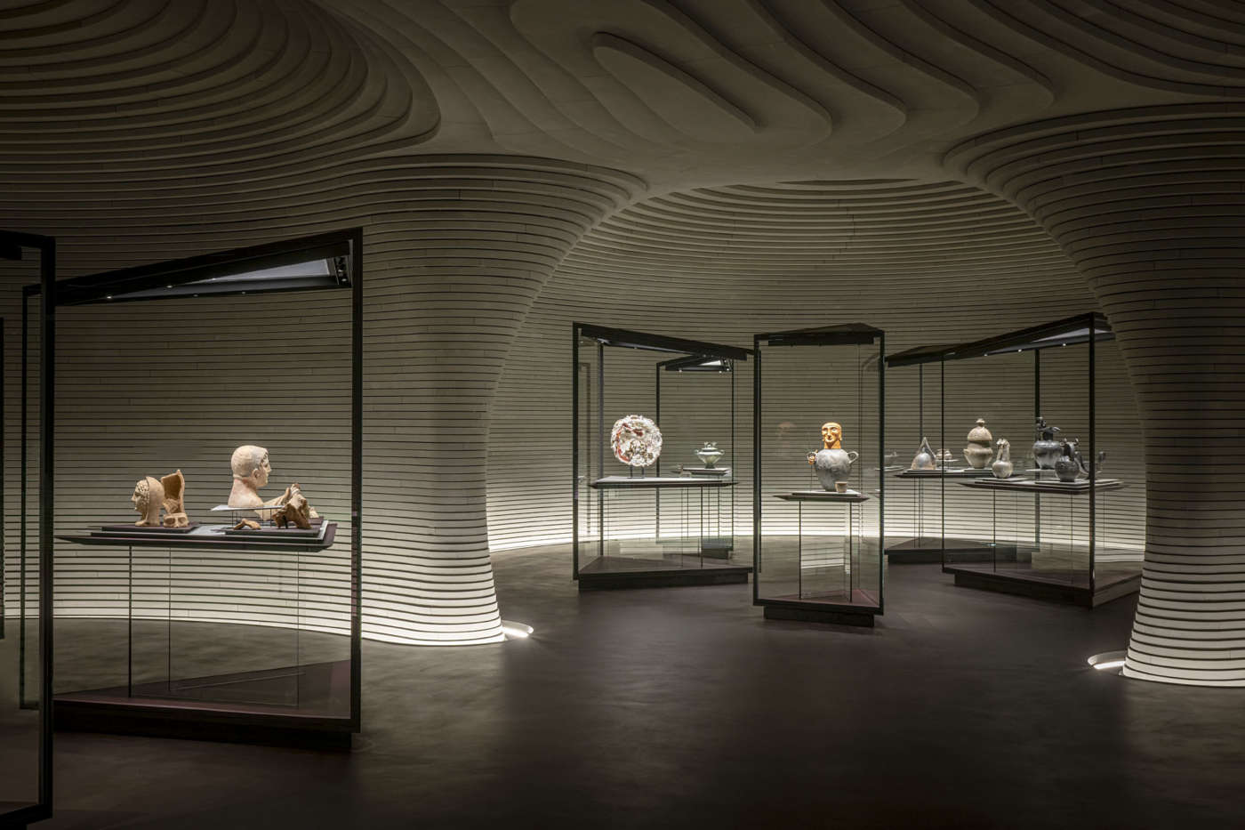 Allo spazio ipogeo si accede dall’ingresso principale: attraverso una scala intagliata nella pietra serena, materiale estratto dalle cave tosco-emiliane, si arriva allo spazio espositivo dedicato alla collezione etrusca composto da tre sale circolari e una grande ellittica. Questo spazio in penombra è avvolto da 30.000 conci di pietra e si trasforma in un viaggio nel tempo dell’arte, nelle sue espressioni tecniche, poetiche e umane. Unitario e fluido, è ispirato alle tombe di Cerveteri, fra le poche architetture etrusche rimaste.
