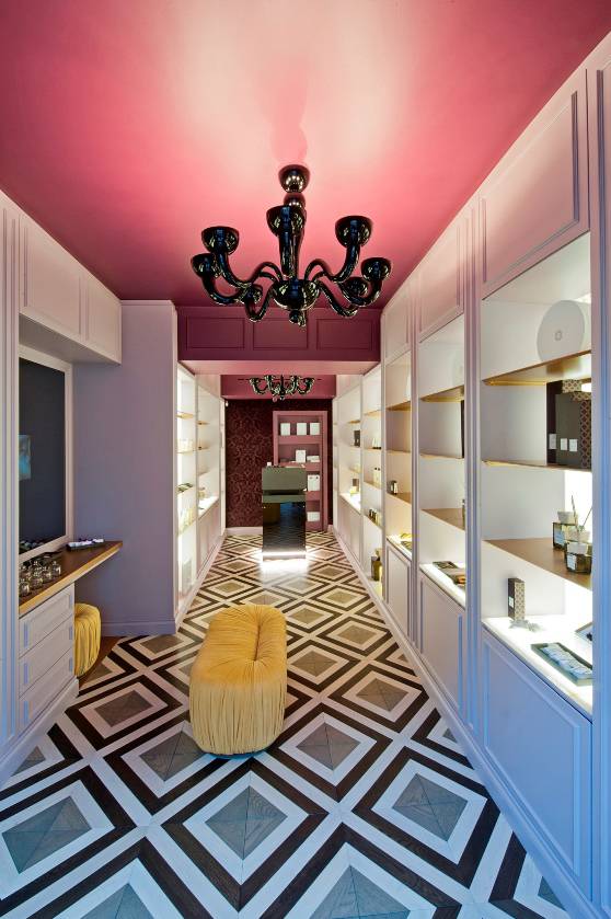 Il progetto del Layout prevede un ingresso (in ferro antracite) che rievoca la tipica bottega di inizio Novecento, All’interno, l’accoglienza è invece quella di un salotto liberty dove un elegantissimo pavimento realizzato in parquet a motivi romboidali, viene avvolto dalle tonalità prugna e glicine scelte per il soffitto e le finiture laccate degli arredi realizzati su misura e su disegno.