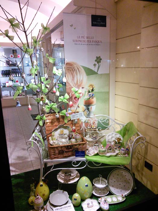 Le vetrine vengono rinnovate ogni 10 giorni circa allestendo i prodotti secondo colori e temi che seguono le stagionalità. Sono curate personalmente dal titolare che introduce con creatività anche materiali di scarto e supporti ecologici. Stessa cura è riservata al packaging che adotta da diversi anni un unico colore distintivo, l’arancione. Insieme ai migliori marchi del settore tavola – si parla di Villeroy&Boch, Royal Copenhagen; WMF e Alessi; Cristal Sevres e Riedel – la proposta merceologica è oggi implementata per adattarsi ai trend del mercato e alle richieste del consumatore. Attualmente è impostata sul tema “cucina&Co” aprendosi quindi anche al mondo dei piccoli elettrodomestici (Kitchen Aid, Casa Bugatti, Brandani), alle macchine per il caffè espresso (Lui l’Espresso) e agli attrezzi di design per la preparazione del cibo (Schoenhuber). Per ultimi ci sono anche gli accessori per la telefonia e i tablet che interessano un pubblico più giovane e moderno.