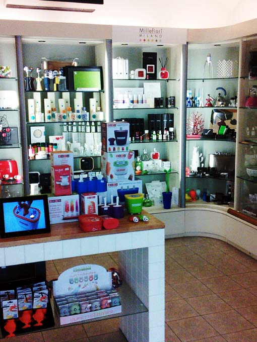 Originariamente il punto vendita aveva dimensioni più modeste rispetto alle attuali. Solo cinque anni fa si è realizzato un soppalco e un piano interrato cosicché oggi l’attività di vendita è esercitata su di un’area complessiva di 150 mq, parte della quale (piano interrato) è strutturata per accogliere corsi e presentazioni di prodotti per la cucina aperti al pubblico. Gli articoli sono esposti in base ad un criterio di utilizzo dando risalto ai colori. Se la parte superiore è dedicata a quelli per la tavola e la cucina, al piano terra sono raccolti i prodotti che esortano all’acquisto rapido e di impulso. Lo spazio espositivo mantiene nel suo complesso uno stile d’arredo uniforme; è presente un solo corner aziendale che occupa tre metri lineari, ed è quello riservato al marchio Thun.