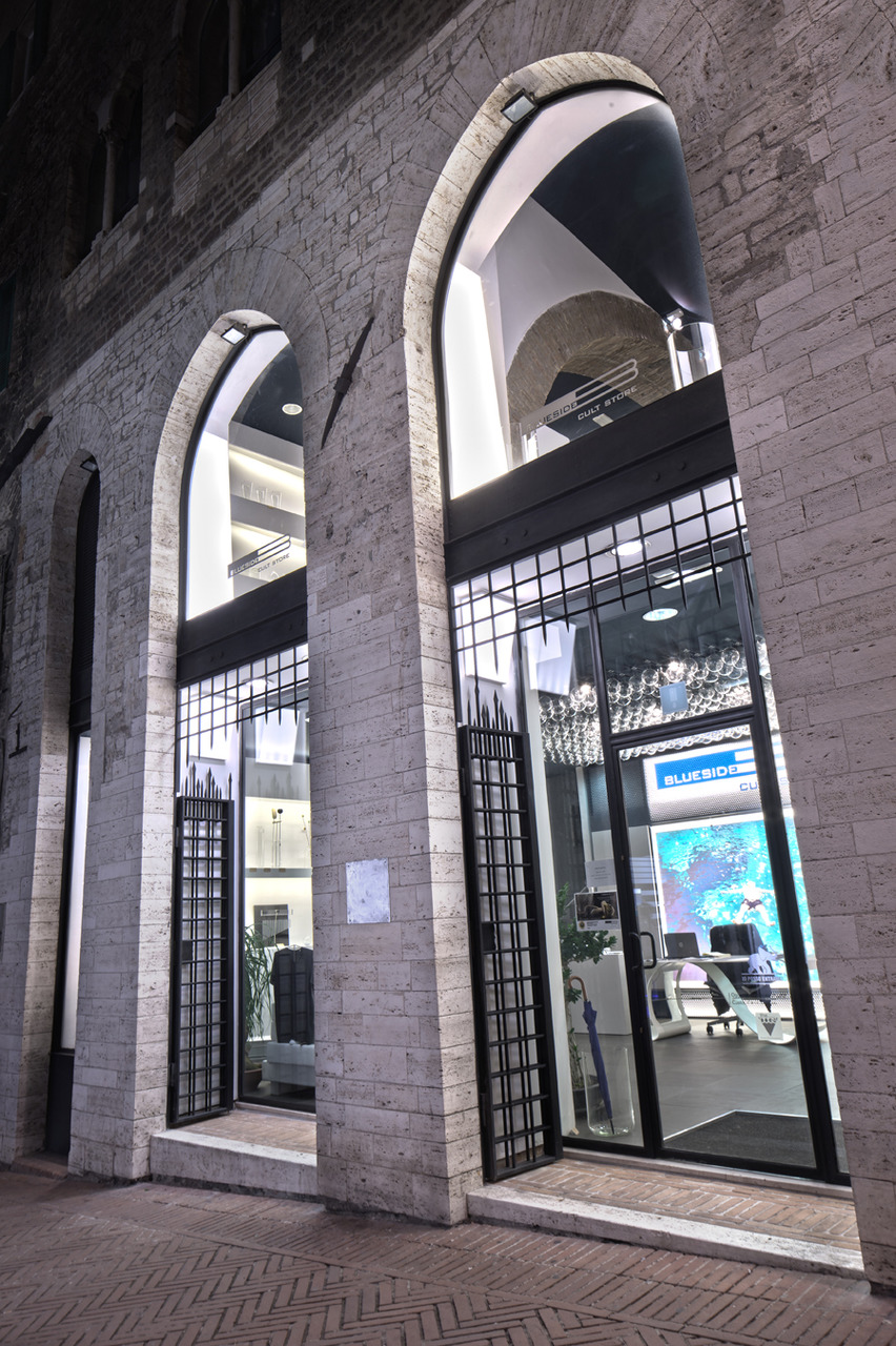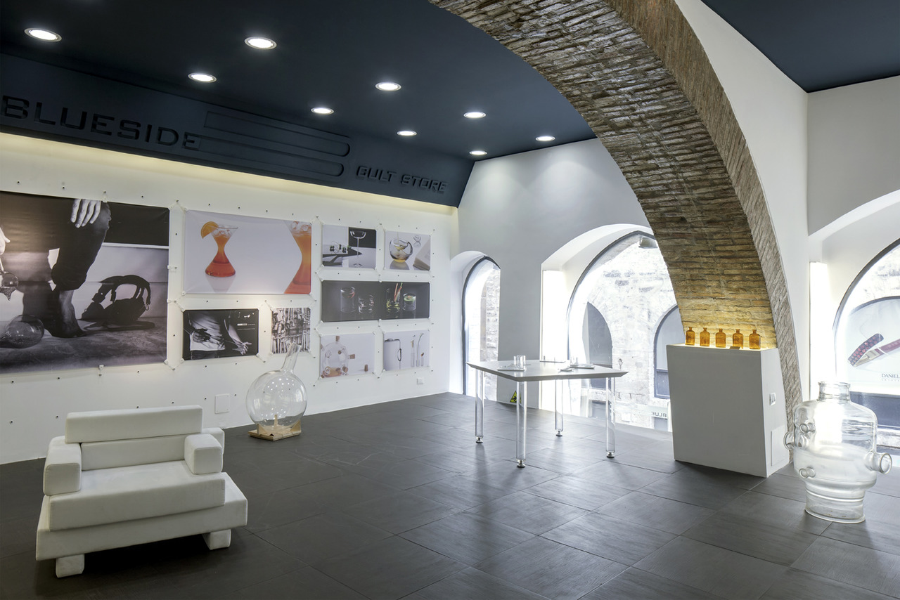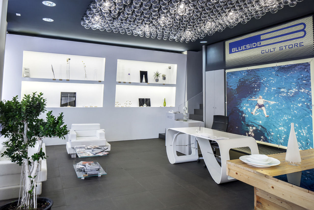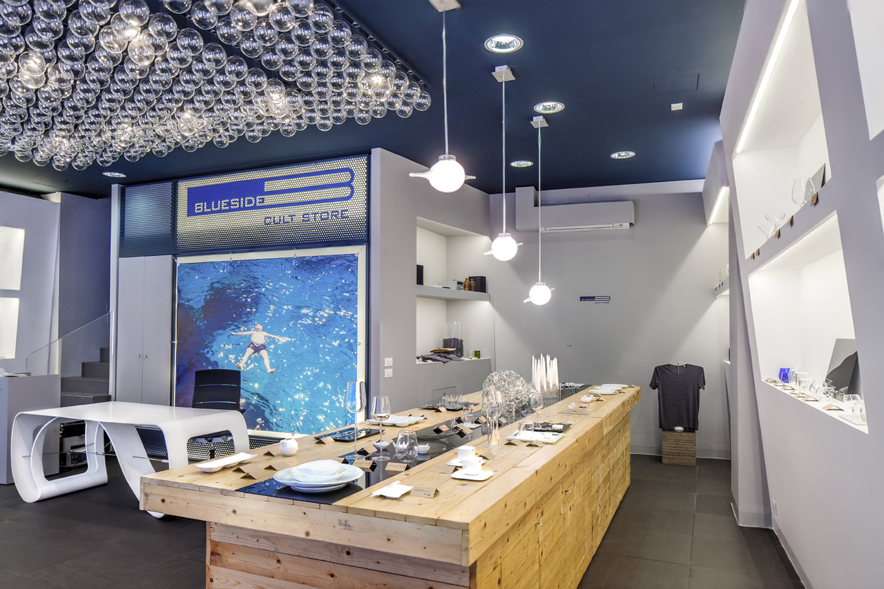 Lo store, oltre che punto vendita, è anche luogo di incontro per la città. Sviluppato su due piani entrambi di 60 mq circa offre al piano stradale l’esposizione di tutta la collezione Blueside unitamente ad una serie di prodotti che definiamo “vintage” e che sono antichi oggetti in vetro propria della tradizione scientifica. Logo e gigantografia al centro del negozio riprendono l’immagine dei nostri cataloghi, e si riferiscono al concetto di blu inteso come relax, momento intimo, isolamento dal mondo veloce e confuso, amore per le bellezze della vita e per gli aspetti emozionali di essa…in pratica il concept da cui nasce Blueside. Al piano superiore continua l’esposizione dei prodotti di vetro vintage ma soprattutto abbiamo uno spazio molto più libero dotato di bancone bar con tutte le utenze dove è possibile organizzare degustazioni, corsi di cucina, mostre fotografiche e artistiche in genere, piccoli concerti…Tutto naturalmente a numero chiuso e su invito.