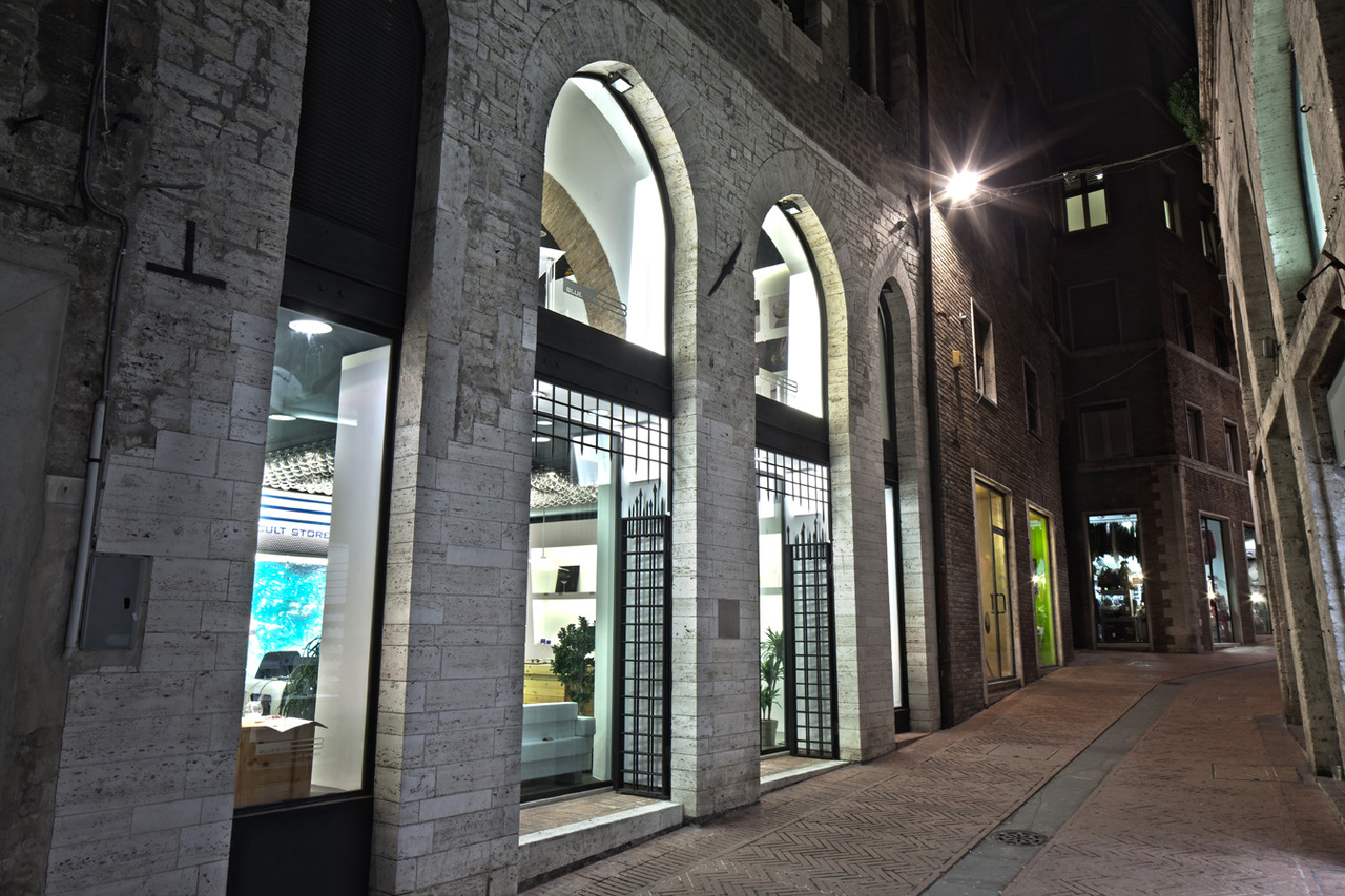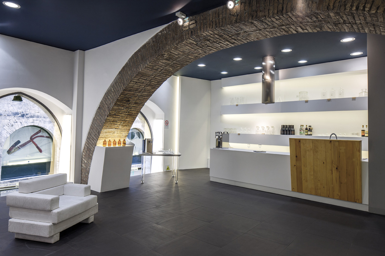 Quattro vetrine ad arco sesto acuto lasciano possibilità di vedere gli interni dello store dando spettacolo dello svolgersi di iniziative aperte alla clientela. Sviluppato su 120 mq è diviso in due aree, una prettamente di vendita, al piano terreno, e una di ricevimento e degustazione, con cucina e bar, al piano superiore. I clienti vengono accolti in un luogo esperienziale dove possono apprezzare i prodotti attraverso un percorso emozionale che incontra preziosità, purezza, trasparenza, bellezza, armonia, essenzialità, stile, unicità, multisensorialità, atmosfera, relax, passione, slow life, convivialità e radici. Fattori singolari che sono anche identificativi dello spazio stesso e che vengono trasmessi al pubblico anche attraverso occasioni d’incontro.