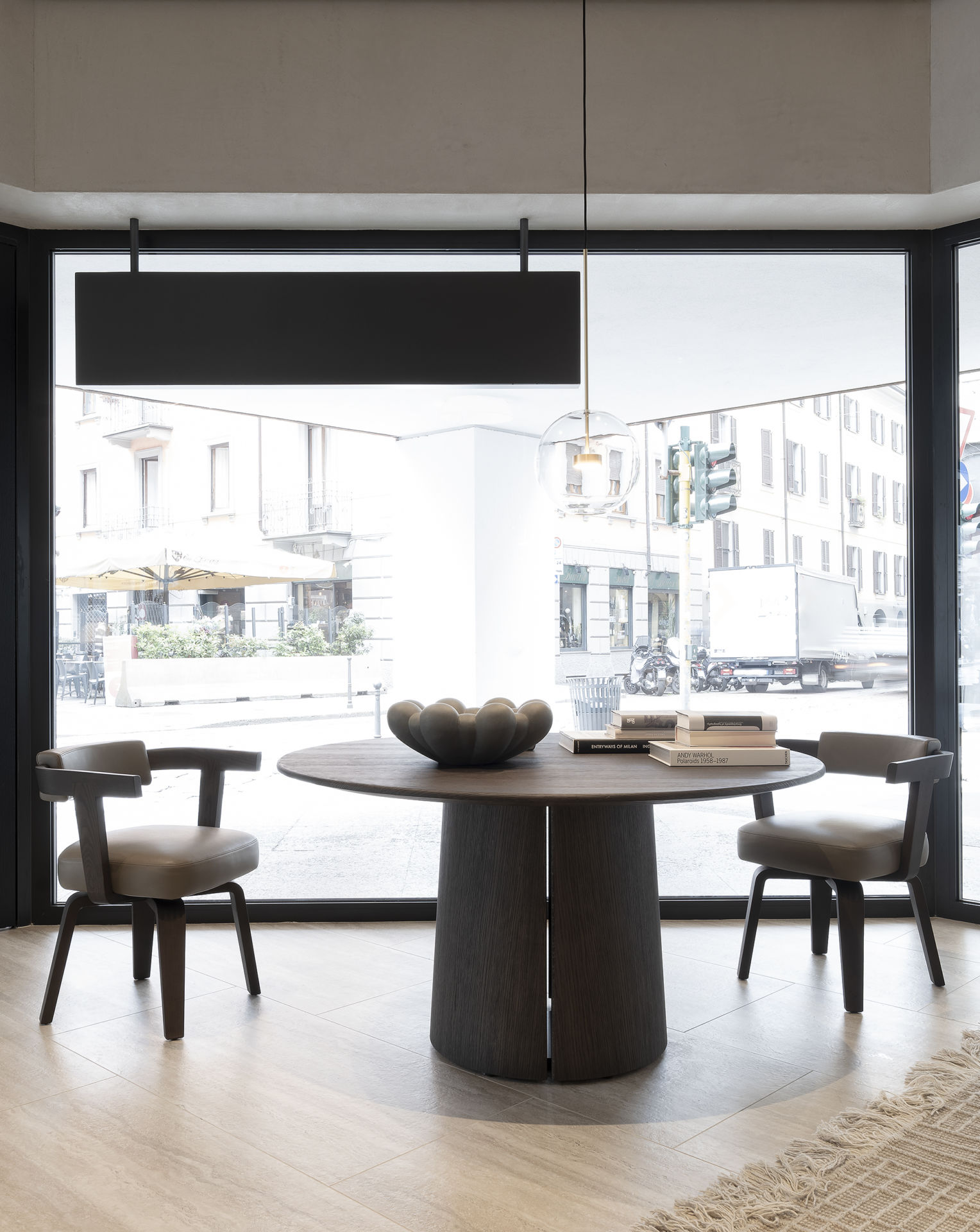Poste su via Solferino, le ampie vetrate del nuovo spazio incorniciano alcune delle proposte del brand, introducendo l’ospite al percorso materico da vivere al suo interno. Un percorso caratterizzato da toni chiari del Rovere Sunrise che riveste le pareti e del Travertino selezionato per la pavimentazione. Un ambiente elegante, domestico, per vivere una sequenza di ambientazioni suggestive.