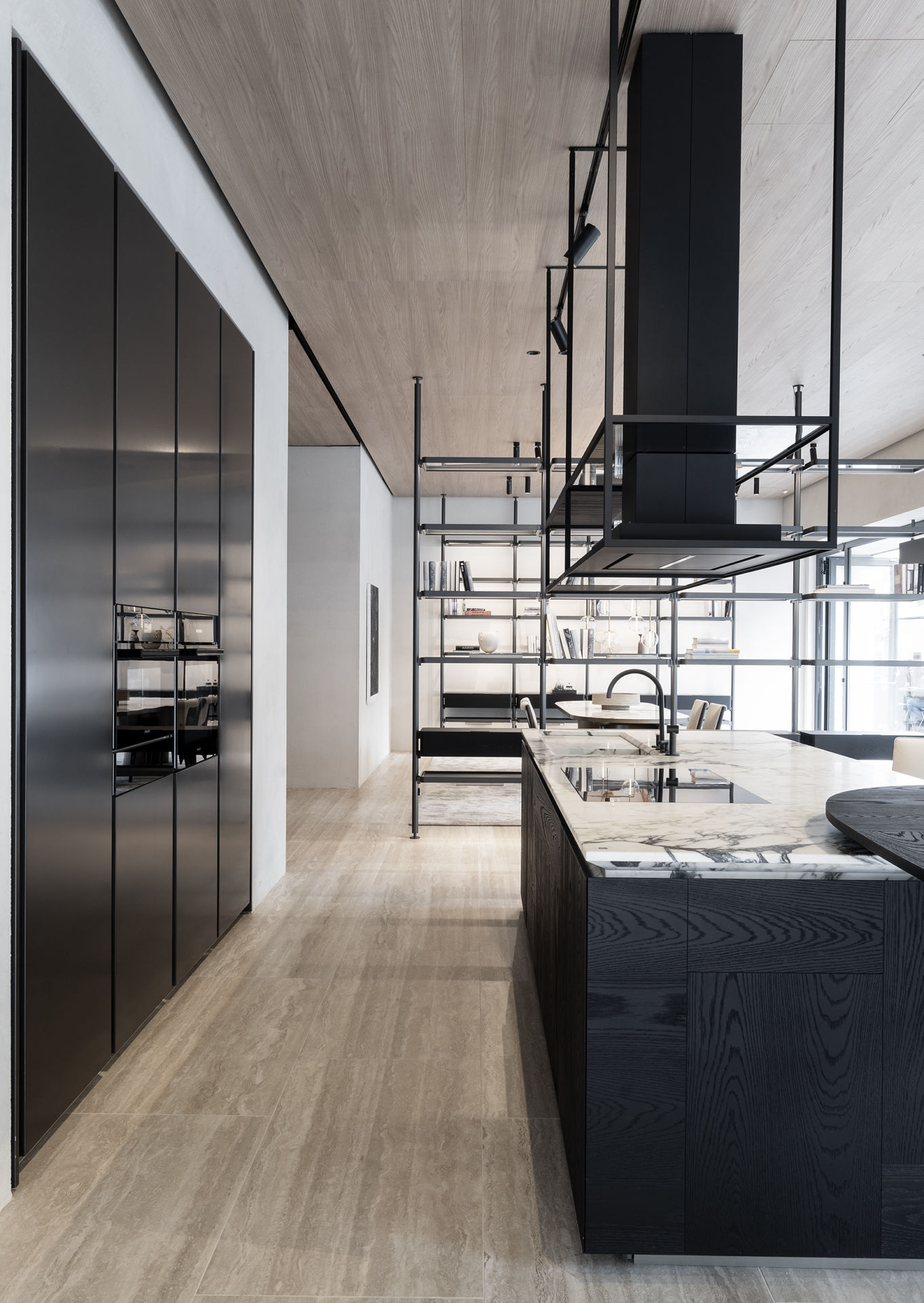 La zona cucina vede protagonista Intersection, vestita di un elegante top in marmo, vanta il sigillo Dada Engineered, espressione della distintività e della specializzazione dell’azienda nel comparto delle cucine.