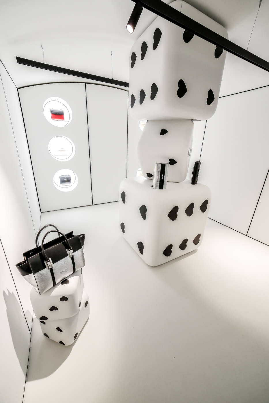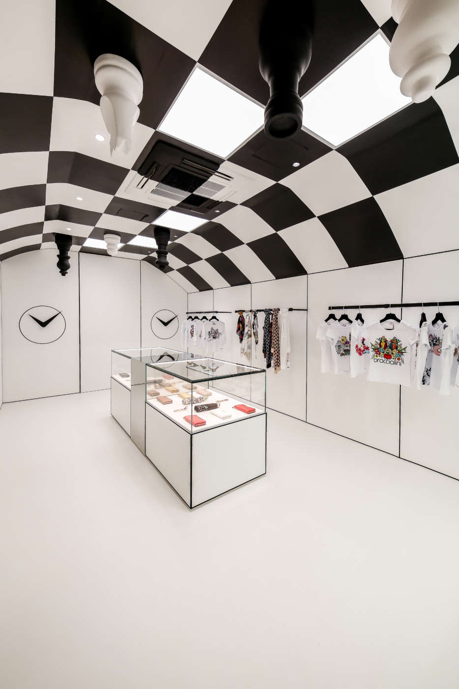 Secondo questo mood, salendo al primo piano si è colpiti dalla presenza di un elemento espositivo di forma totemica, composto da dadi da gioco sovrapposti, che immergono il cliente in un’esperienza fiabesca. L’effetto continua entrando nella sala attigua, dove una scacchiera si plasma sulla volta, lasciando cadere delle pedine che come in un’opera Metafisica perdono l’influenza della forza di gravità seguendo l’andatura curvilinea della volta stessa.