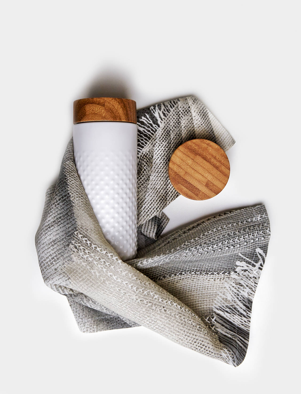 Accanto ai pregiati arredi tessili, comparivano caraffe, piccoli servizi da tavola, e travel mug, le tipiche tazze per il thè da portare con sé per un consumo on the road, secondo un uso tipicamente asiatico. Le forme sono sempre essenziali: cilindri smussati, caraffe tronco-coniche, ciotole semisferiche dalle geometrie appena smorzate dalla necessità di un utilizzo. Filo conduttore, il ricorso al pattern decorativo nelle texture morbide che si declinano nei colori del bianco e nero, del giallo e del tortora, secondo nuance naturali riflesse nei tessuti abbinati.