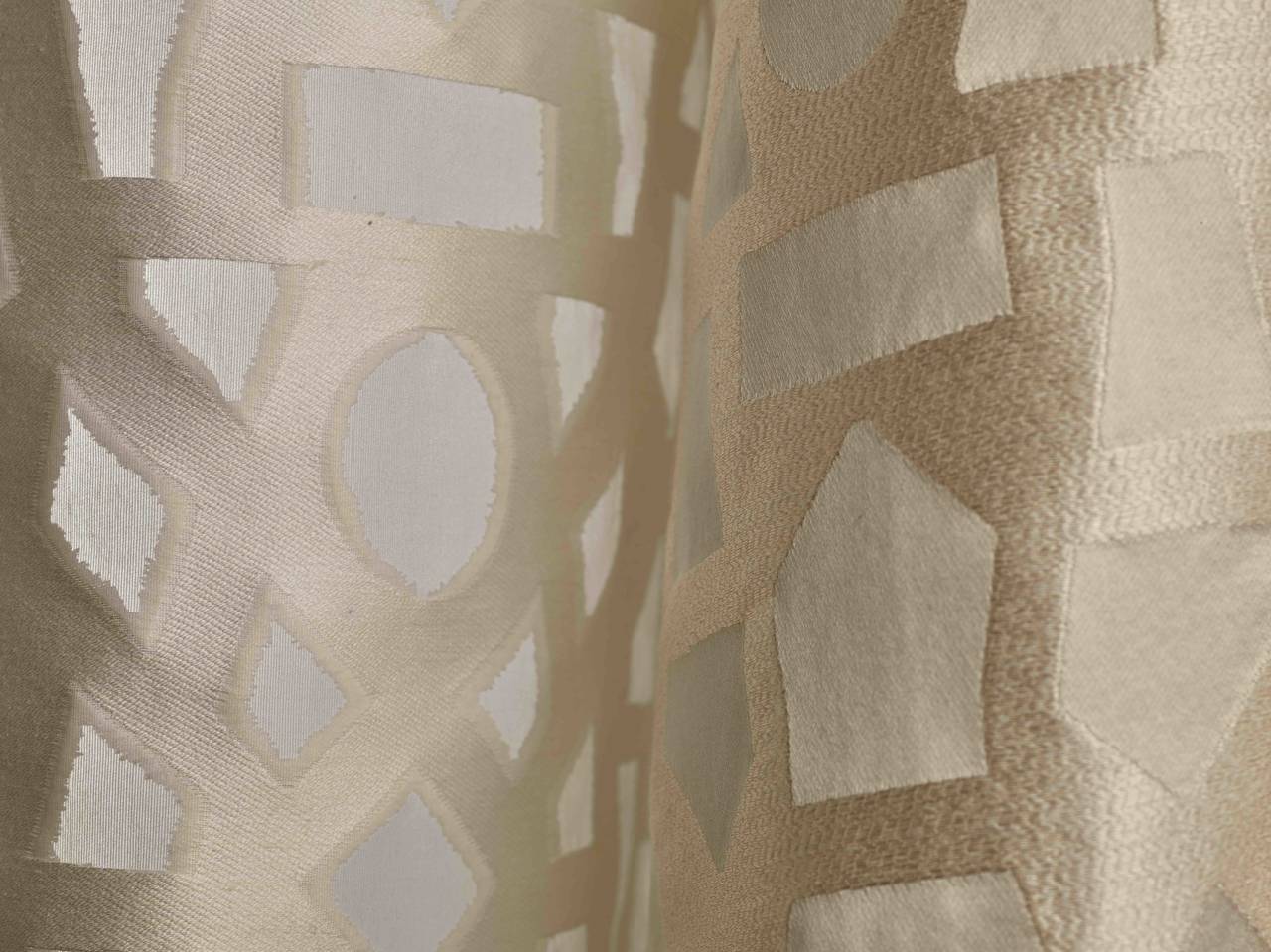 Sul fronte dei ricami la nuova colledione Dedar presenta Barchetta, con base di panama di lino leggera e in grande altezza, e dettagli applicati in lino e cuoio (disponibile anche in versione multiriga e con balza). Grecale, invece, presenta un ricamo in filato di juta utilizzando la tecnica soutache su finissima tela in puro lino, mentre Vienna Voilage ha un ricamo paglia di Vienna su tessuto ignifugo, lavabile in acqua, dall’apetto naturale del cotone. Il ricamo paglia di Vienna è offerto anche su fondo in taffetà.