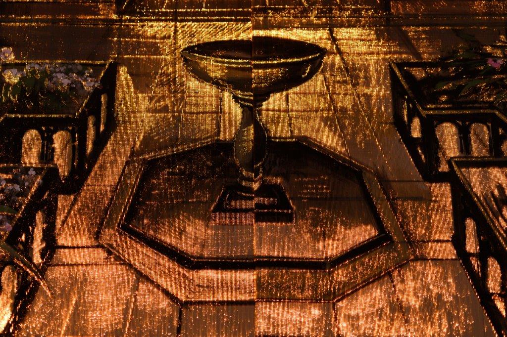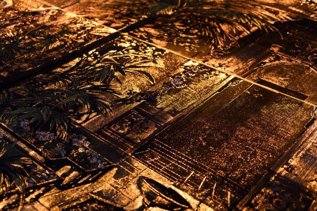 “Per questo progetto DreamLux® – spiega Bressana – avevamo ricevuto dal cliente un’ immagine del palazzo reale, uno screenshot che dava una indicazione generale. DreamLux® ha realizzato lo schema dei pannelli in Cad e mi ha inviato il file. Come sempre ho interpretato secondo la mia ispirazione l’input del cliente utilizzando molto oro. Far emergere ombre e sfumature lavorando la fibra ottica non è stato facile. Il pannello era molto grande, abbiamo dovuto attrezzare un capannone. E’ stato necessario un impegno di due settimane. Ho operato a mano e con strumenti di pittura“.